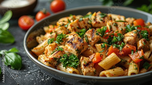 Flavorful rigatoni pasta with grilled chicken and fresh herbs served in a rustic bowl. Generative AI