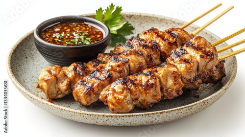 Flavorful thai grilled chicken gai yang served on a plate accompanied by a tantalizing dipping sauce for a feast