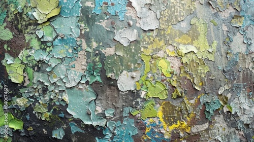 Flecks of multicolored paint tered across a battered surface creating a mosaic of greens blues and grays