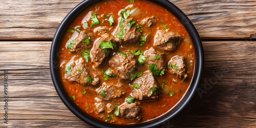 Flemish Stew (Stoofvlees) in black bowl on rustic wooden table