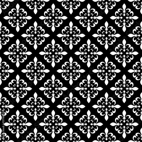Fleur-de-lis seamless pattern. Vector illustration. Black white template. Floral texture. Elegant decoration, royal lily retro background. Design vintage for card, wallpaper, wrapping, textile.
