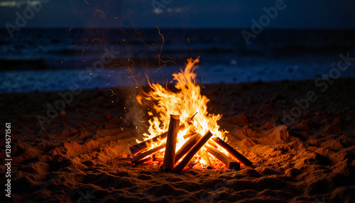 Flickering bonfire glowing on sandy beach at night, summer warmth