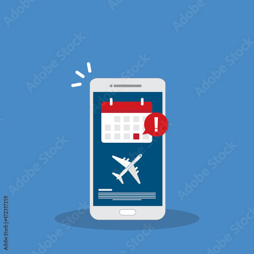 Flight delay info or travel agenda. Online reminder. Important airline airplane departure notification message on mobile phone. `