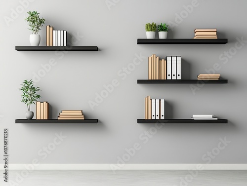 Floating black metal shelves for document storage, sleek and contemporary design for a minimalist office