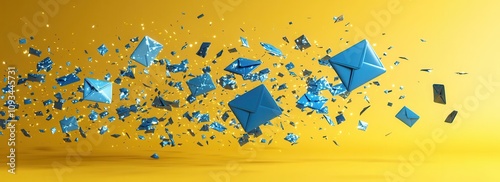 Floating blue envelopes against a vibrant yellow background symbolize the speed and efficiency of modern email marketing strategies, banner, background