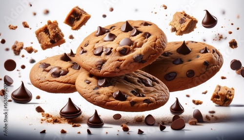 Floating Chocolate Chip Cookies with Chunks on White Background – High Resolution"