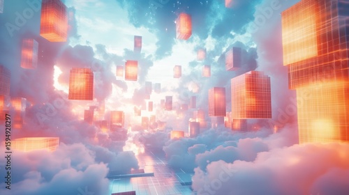 Floating city buildings, cloudscape, futuristic. Possible use Background for a futuristic concept