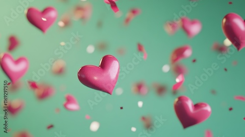 Floating cute little pink hearts at green screen chroma key background. Romantic Valentines day confetti celebration. Love and joy. Romance party.