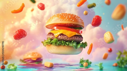 Floating Delight: A Juicy Burger in a Dreamy Sky