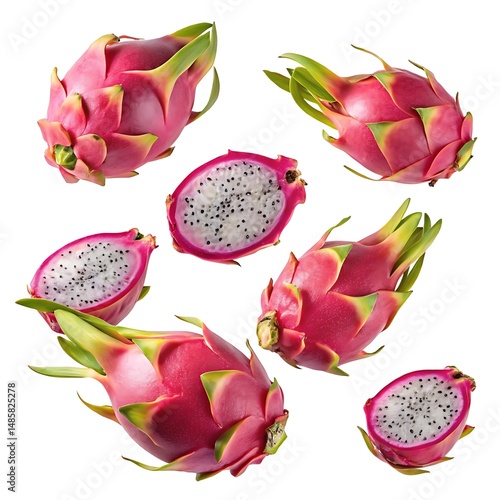 Floating Dragon Fruit Collage Showing Whole and Halved Fruits on White Backdrop