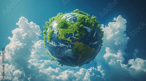 Floating Earth with Lush Greenery Surrounded by Clouds and Blue Sky