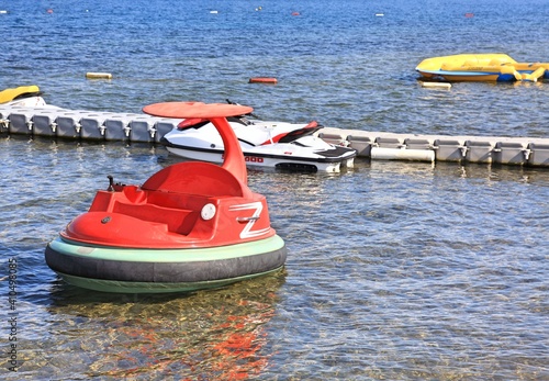 Floating equipment moored with buoys on a clear sea. Paddle boat and water scooters