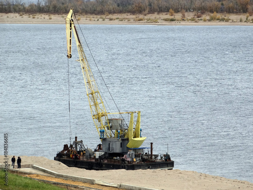 Floating excavator on the construction of the new waterfront