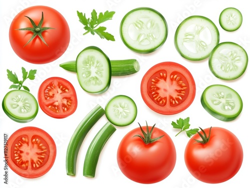 Floating fresh tomatoes and celery leaves on a white backdrop, perfect for showcasing healthy eating themes, cooking recipes, and food preparation ideas.