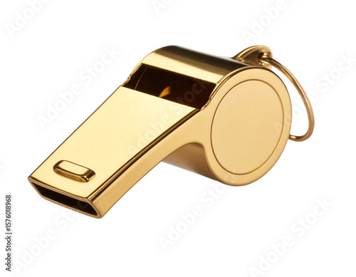 Floating Golden Whistle with Shiny Reflections, Transparent Background.