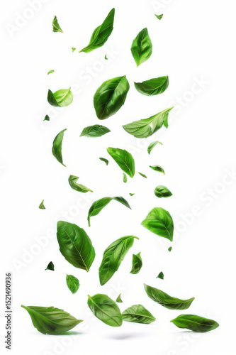 Floating green basil leaves on a white background, highlighting their fresh, vibrant color and aromatic essence.