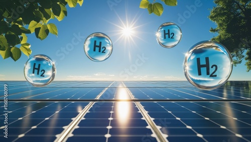 Floating H2 bubbles over solar panels glowing under the sun, showcasing renewable energy and sustainable development