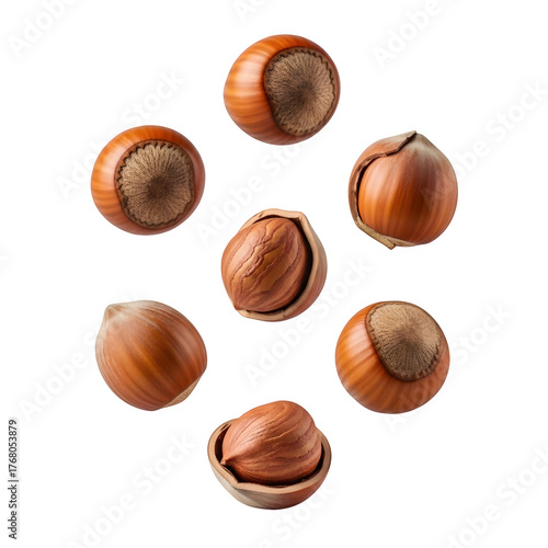 Floating Hazelnuts and Slices PNG Isolated on Transparent Background. Dynamic, Weightless Nut, Ingredient, and Food Advertising Graphic Element