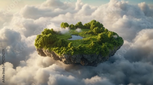 Floating island with lush greenery and a serene pond amidst fluffy clouds, AI