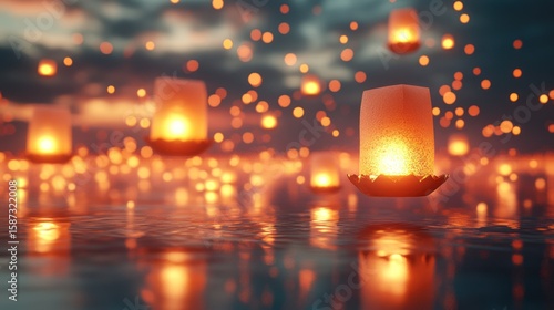 Floating lanterns at sunset over water; peaceful scene; possible use for backgrounds or advertisements