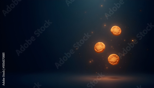 Floating latkes with a magical glow for Hanukkah celebration against a dark background.