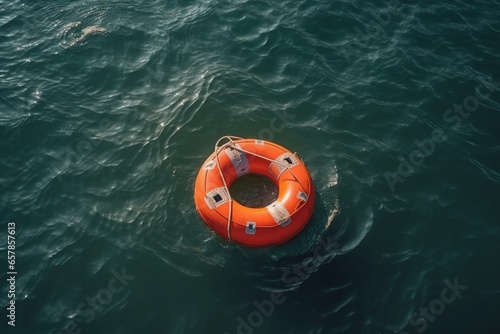 Floating lifebuoy on water. Rescue device. Overhead view. Generative AI