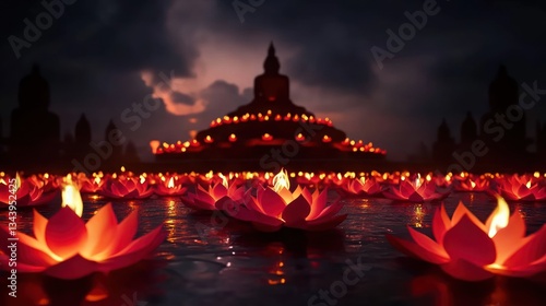 Floating lotus lanterns illuminate a serene Buddhist temple complex at twilight.