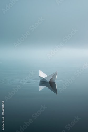 Floating Origami Boat on Calm Reflective Water Representing Dreams and Serenity
