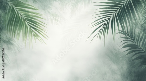 floating palm leaf silhouettes, foggy white environment, elegant botanical elements, faded green palette, ethereal mood, organic shapes, layered transparency, light and airy, premium lifestyle
