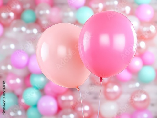 Floating pink and white balloons against a dreamy pink bokeh background creating a soft festive and joyful celebration theme