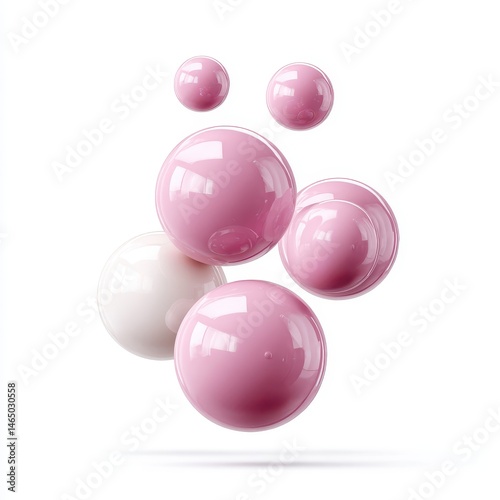 Floating pink and white spheres on white background. Shiny, glossy surface. Abstract 3D render.