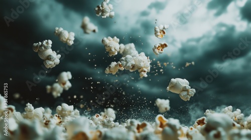 Floating Popcorn in Mid-Air - A dynamic close-up of popcorn kernels floating in mid-air, creating a sense of motion and fun, perfect for snack or movie-related themes.