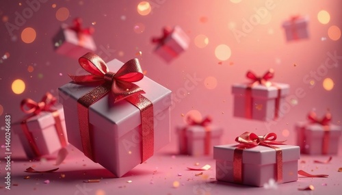 Floating presents, shimmering bows, vibrant hues, photography, ribbon, artwork