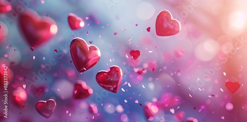 Floating red hearts with confetti on blurred background with bokeh. Bright atmosphere of love and romance. Ideal for Valentines Day, wedding design or romantic celebration