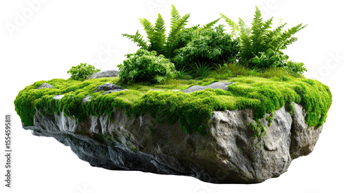 Floating Rock Garden: A lush, green island of moss, ferns, and greenery sits atop a grey, rocky base, isolated against a clean backdrop. This image evokes a sense of tranquility and hidden worlds.