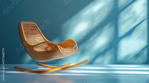 Floating rocking chair, sunlit room, serene interior design, relaxation