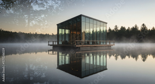 Floating Sanctuary: A modern, glass-walled cabin serenely floats upon a tranquil lake, embraced by a misty morning, blending architecture and nature for ultimate serenity.