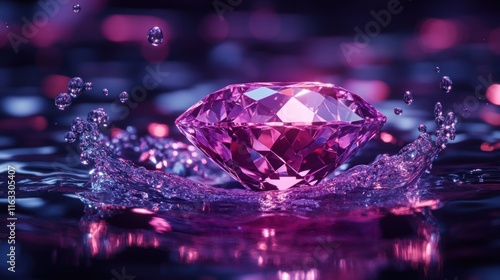Floating serenely on water, the diamond glows under a dramatic interplay of red and purple lights. Water droplets splashing around it make the scene vibrant and luxurious.