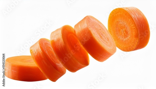 Floating slices of fresh carrot isolated on a white background, perfect for food photography, nutrition ads, and healthy recipe designs