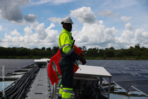 Floating Solar panel farm, black male energy engineer and construction inspecting, renewable energy and installation check with the contractor, eco-friendly and sustainable. Solar energy, sustainable