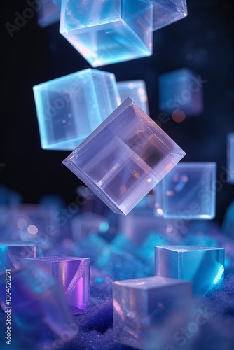 Floating translucent cubes in vibrant colors create a mesmerizing visual display in a dark space