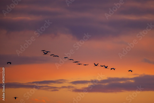 Flock of birds, Common Crane, migration in Hortobagy National Park, UNESCO World Heritage Site, Puszta is one of largest meadow and steppe ecosystems in Europe, Hungary