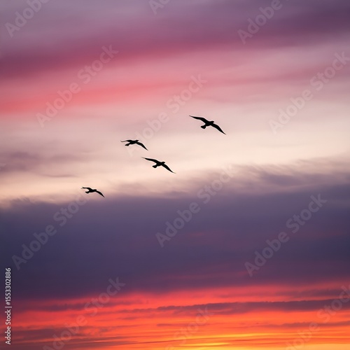 Flock of birds flying in formation across a purple pink sunset sky, silhouette effect, tranquil background copy space