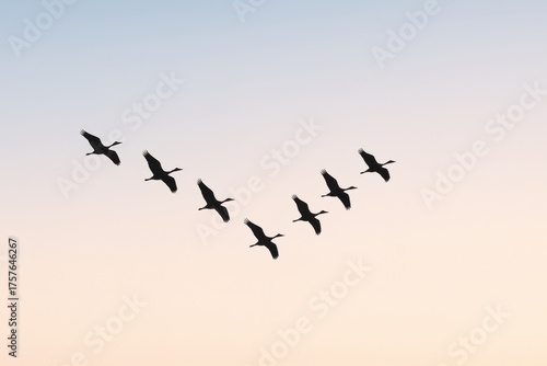 Flock of Birds Flying in V Formation Against a Gentle Sky Background