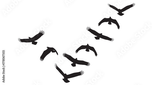 Flock of birds flying in V formation Black silhouette Vector illustration Isolated on white background Simple design