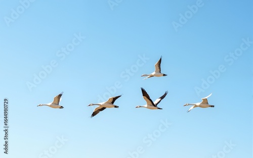 Flock of ducks flying in blue sky. High quality