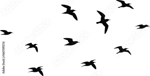 Flock of flying birds, black silhouettes on white background, vector illustration, nature, wildlife, freedom, animal flight, sky, isolated birds, flying motion concept
