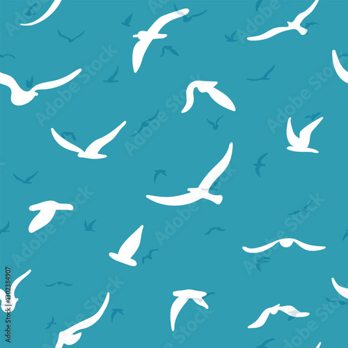 Flock of flying silhouette birds. Birds seamless pattern. White seagulls on a blue background. Vector
