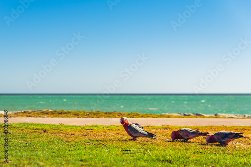 Flock of galahs (Eolophus roseicapilla) - the pink and grey cockatoos feeding on green grass