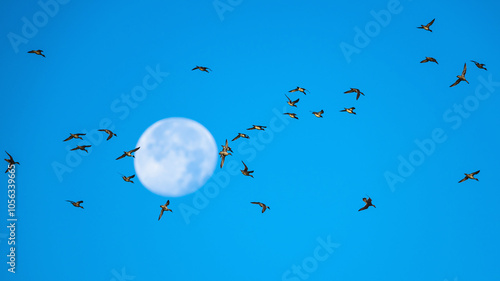 Flock of Northern Pintail, Anas acuta, birds in flight with the moon in the background